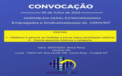 leia maisSINDIFISC-MT, NO USO DAS PERROGATIVAS E ATRIBUIÇÕES QUE LHE CONFEREM O Estatuto da Entidade, convoca os Diretores Titulares e Suplentes, bem como todos os (as) Empregados e Sindicalizados(as) do Conselho Regional de Medicina Veterinária do Estado de Mato Grosso-CRMV/MT.