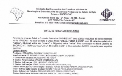 leia maisA apuração da eleição da diretoria do SINDIFISC-MT - triênio 2021/2024, realizada no dia 17 de setembro de 2021, confirmou a chapa única “União, Força e Luta” eleita, com 86 votos válidos.